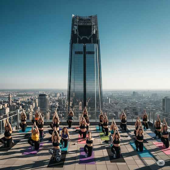 【お題】100階建ての高層ビルの屋上で運動するカーブスの女子