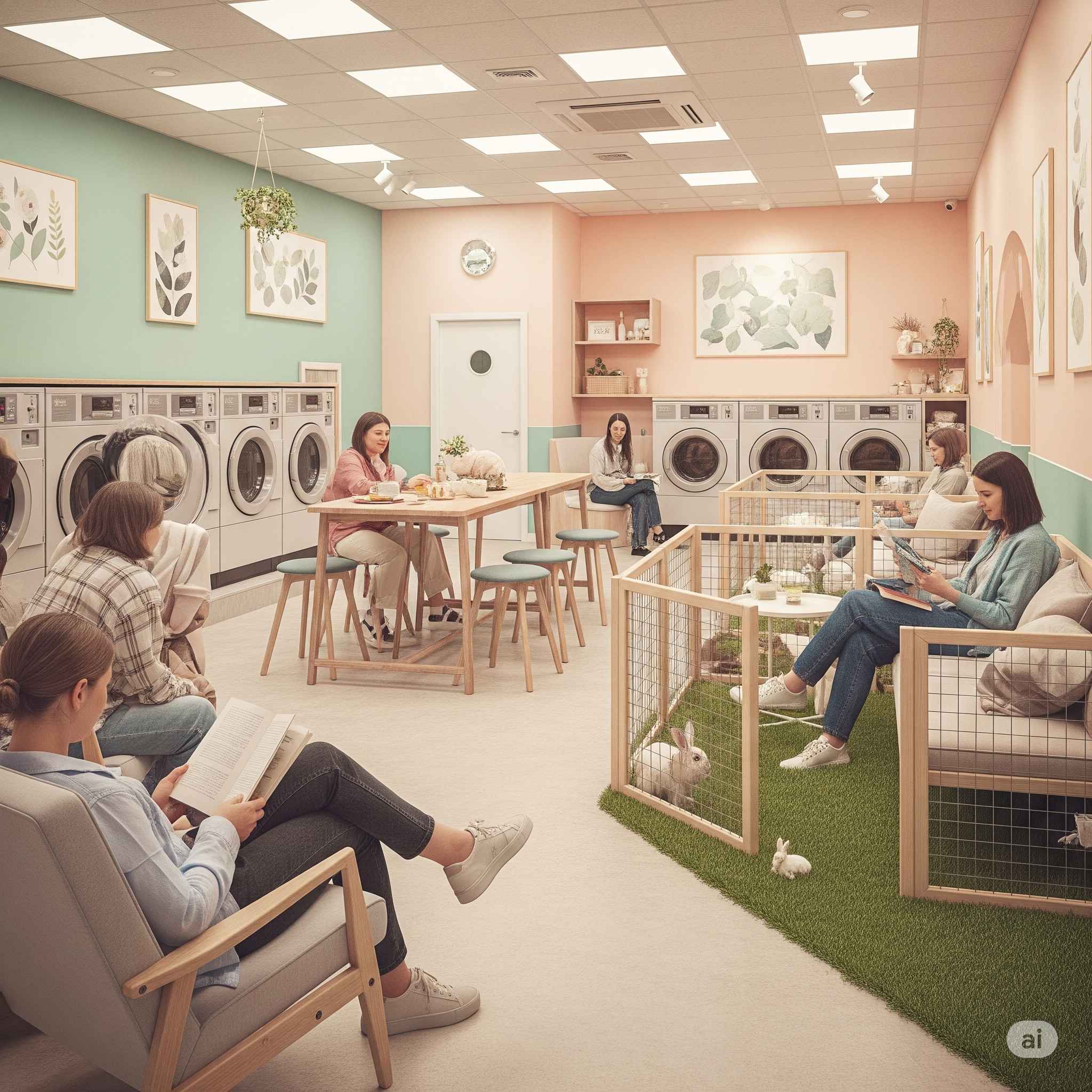 【お題】うさぎカフェとコインランドリーがコラボ。癒やし系コインランドリーでくつろぐ人々