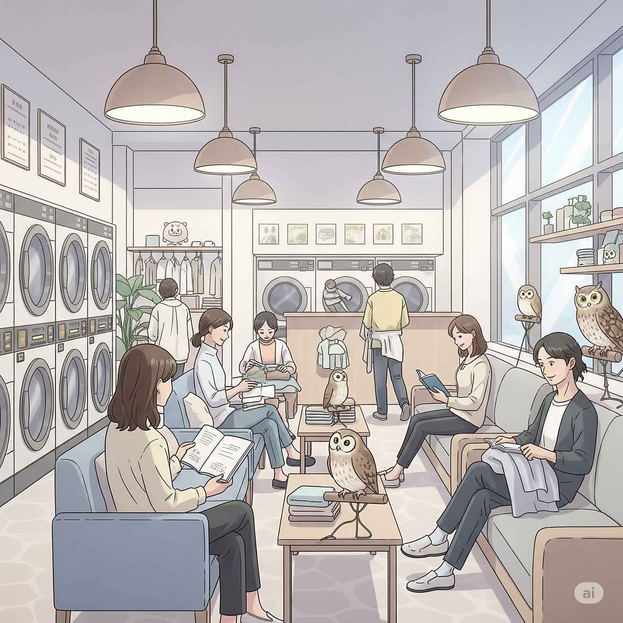 【お題】ふくろうカフェとコインランドリーがコラボ。癒やし系コインランドリーでくつろぐ人々、その様子
