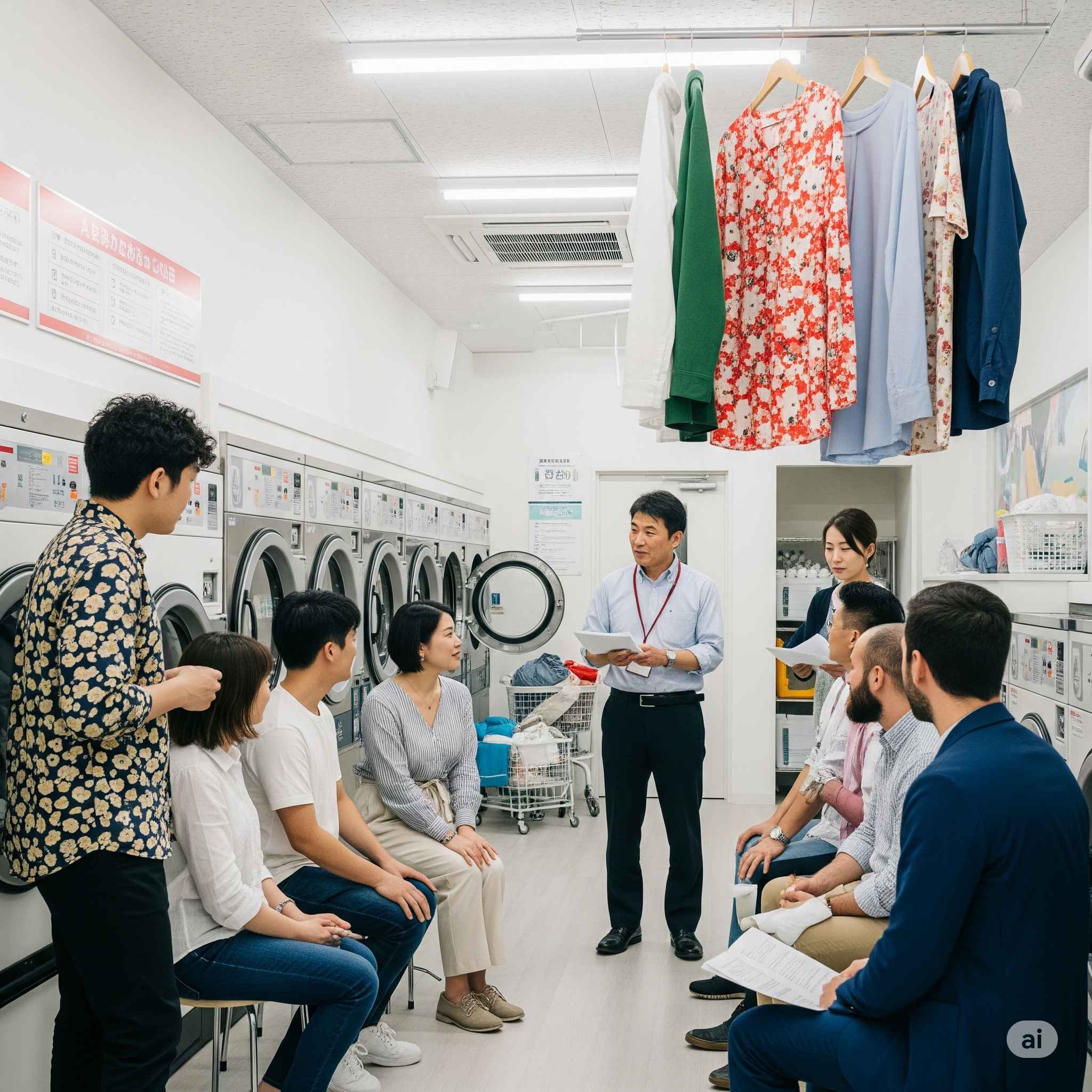 【お題】コインランドリーと語学学校がコラボ、コインランドリーの待ち時間に日本語と日本文化を学ぶ外国人たち