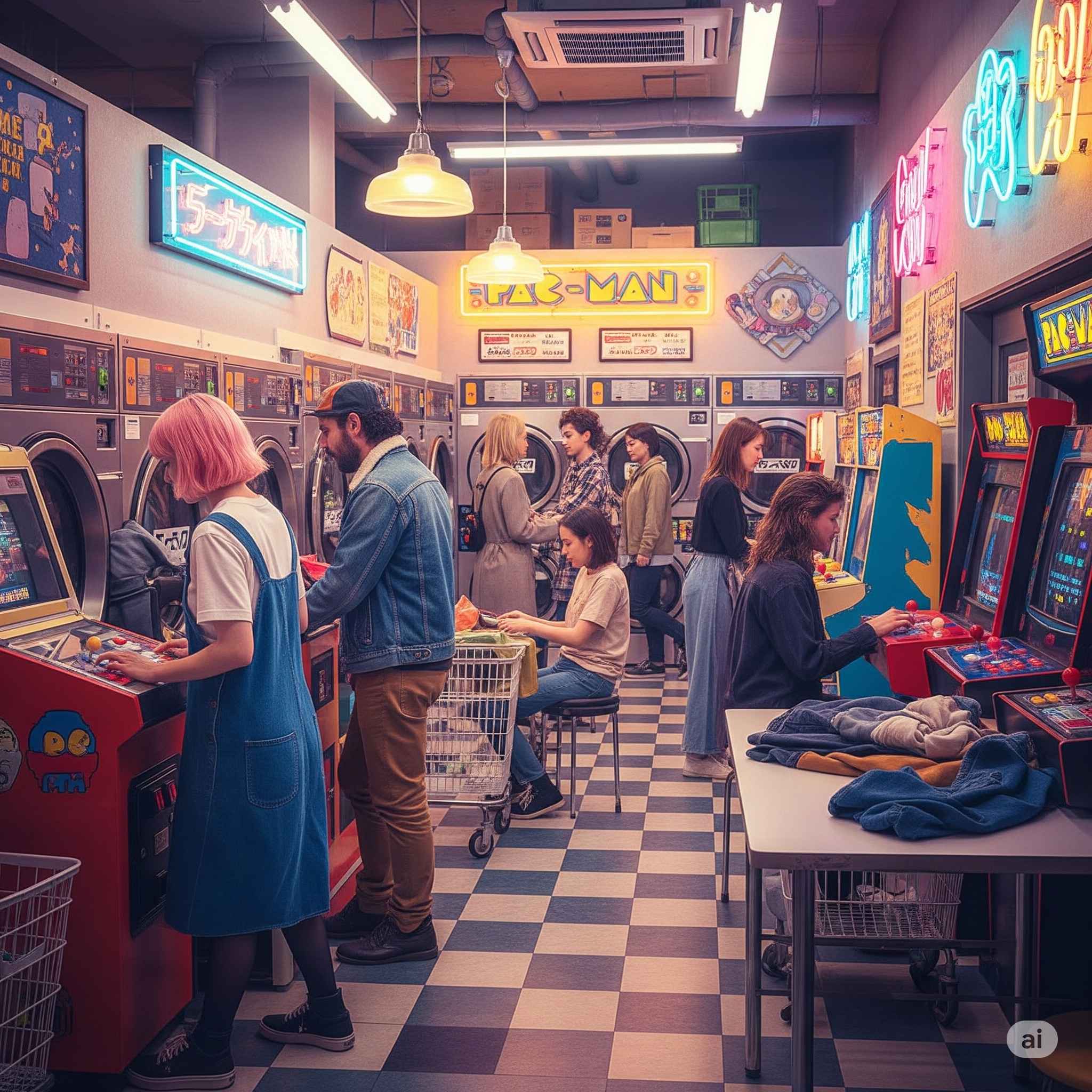 【お題】コインランドリーと昭和レトロゲームセンター界隈がコラボ、待ち時間に懐かしのゲームで遊ぶ人達