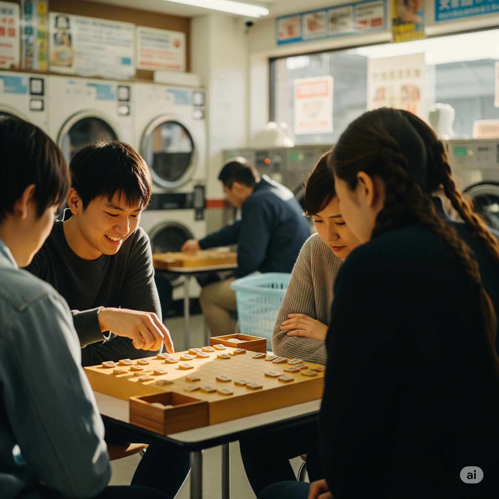 【お題】コインランドリーに併設された将棋スペースで待ち時間に将棋をする人々